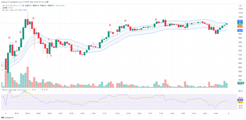 トレードを行ったのは2024年3月5日、さくらインターネットの株が急騰していた日でした。チャートをみて、『まだ上がるだろう』と勢いで買いエントリーしましたが、4回目のエントリーで直後に急落。今でも覚えています(笑)