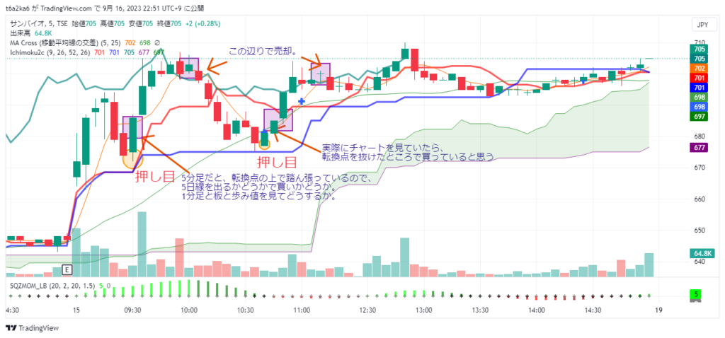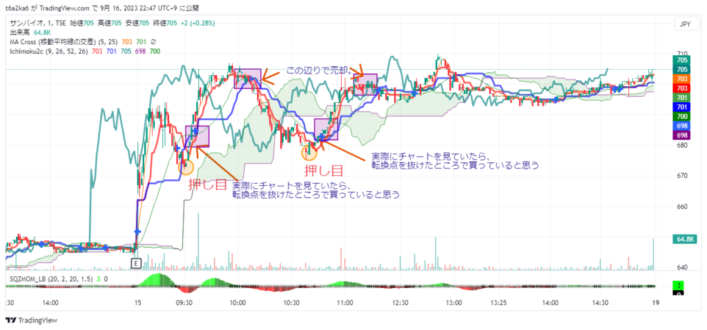 私は恐らく、1分足の転換線を抜けたところで買っていたと思います。売却は1分足なら転換線、5分足なら5日線を下抜けたところで売りやってますね。