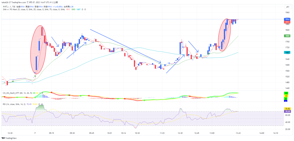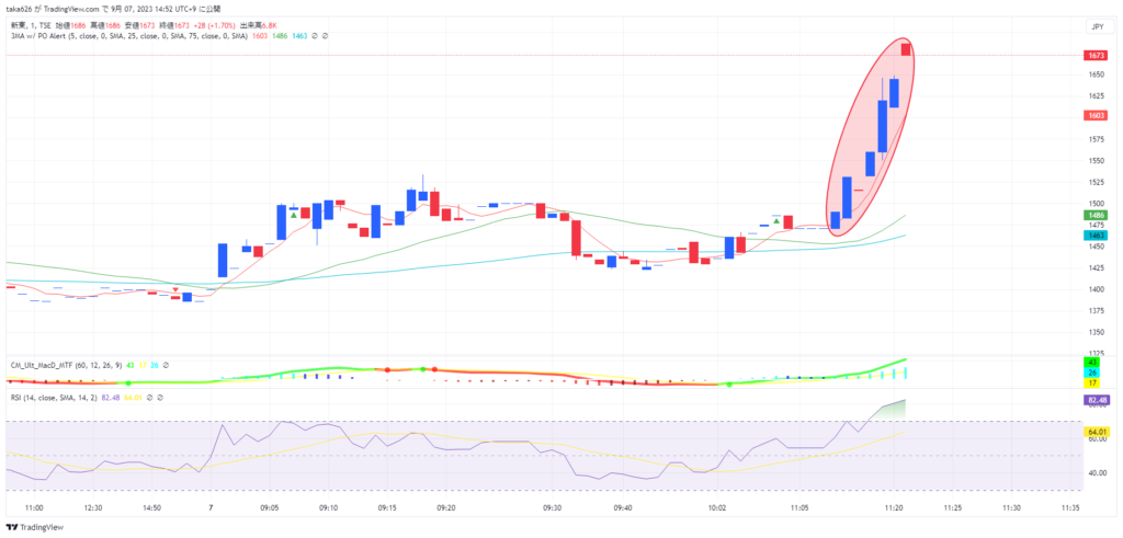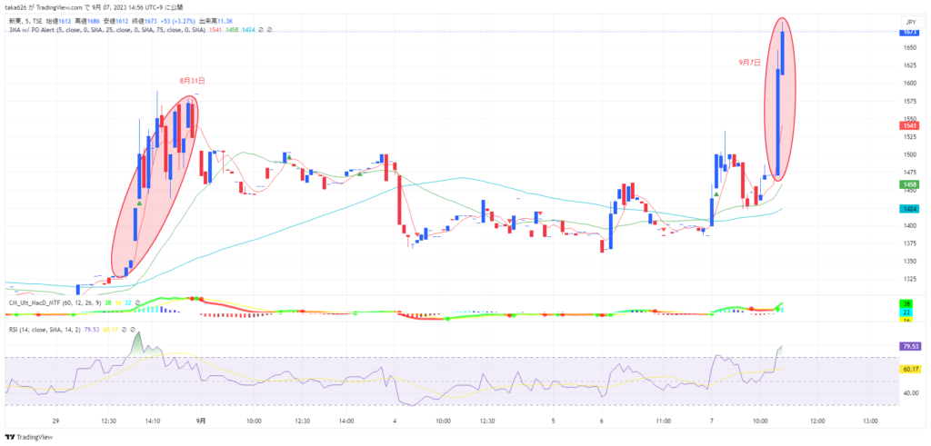 新東についても、前場の終わる数分間でどーんと急騰しました。これも材料らしい材料はわかりません。何か合図があるのでしょうか。