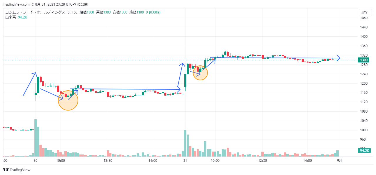 自分は参戦していなかったのですが、マルで囲った所が押し目なのでしょうか。恐らくここらで買って、上げ切って、下がったところで利確でしょうかね。