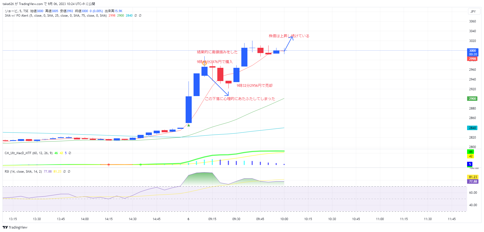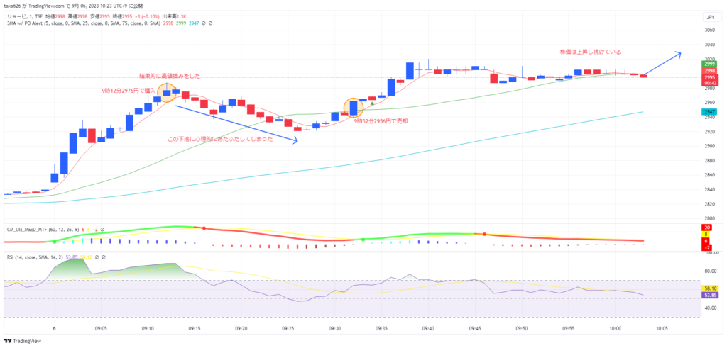 今日のデイトレの取引ですが、最初の高値を掴み、20分程の下落する中、胸中そわそわあわあわしてしまい、少し上がってきたところで損切をしてしまいました。