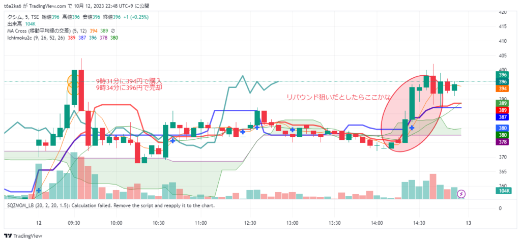 最初のリバウンドした所で売却しようと決め、すぐ戻ったところで売りました。