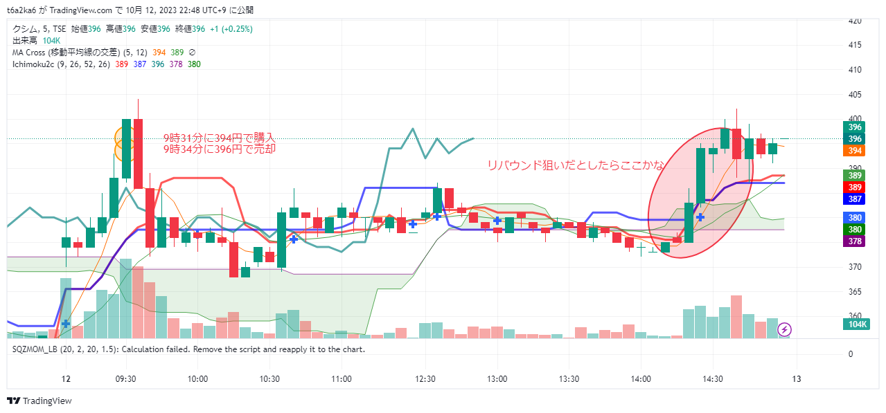 クシムですが、これは寄り付き後の上昇に飛びつきました。しかし、板が売りに走りそうでしたので、すぐ売りました。