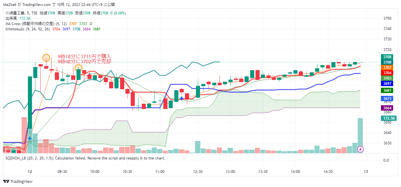 川崎重工業ですが、寄り付き後の上昇が続くと思い、最初の売りが入った所で再度上昇するかと思い、移動平均線も上昇していましたし、買いを入れましたが、そこから下げ一辺倒でしたね。