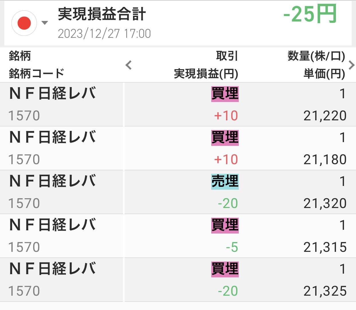 今日は25円のマイナスでした。取引回数は5回でした。