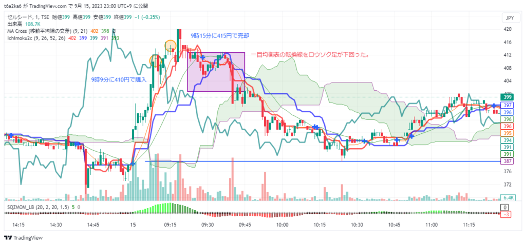 購入後下がりましたので、一目均衡表の転換点を割り込んだら売ろうと思いました。またあがりましたので、ここだろうと言う所で売却しました。