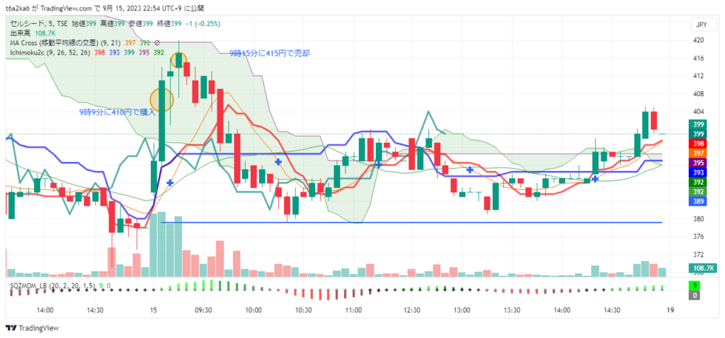 今日は見たときに勢いのあったセルシードにINしました。1分足を見ると、INが遅かったような。自分の中ではここだと思って入ったのですが。。。
