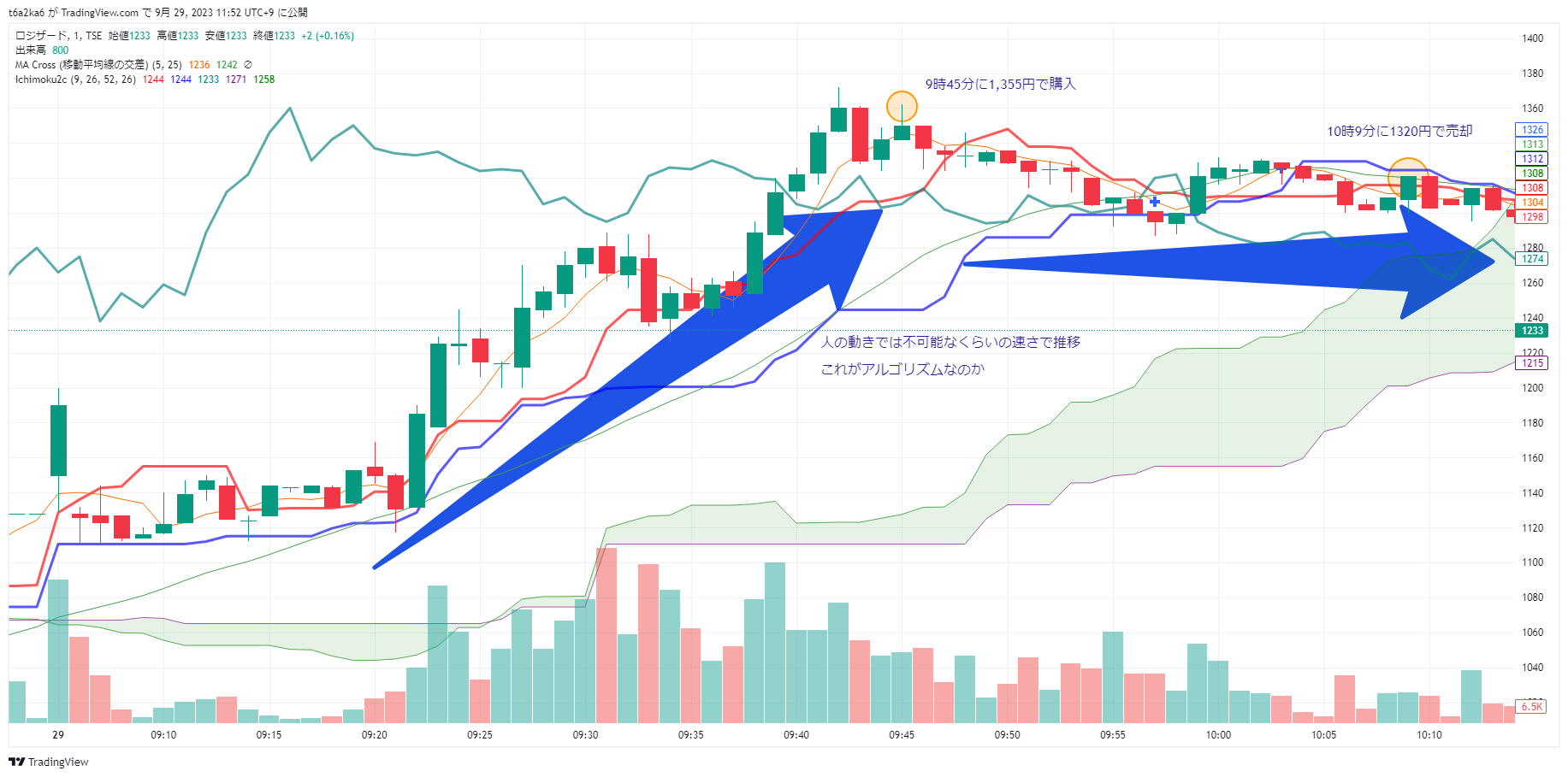 ロジザードですが、アルゴリズムなのか何なのか素人の私にはよくわかりませんが、買いも売りもめちゃくちゃな動きをしていました。