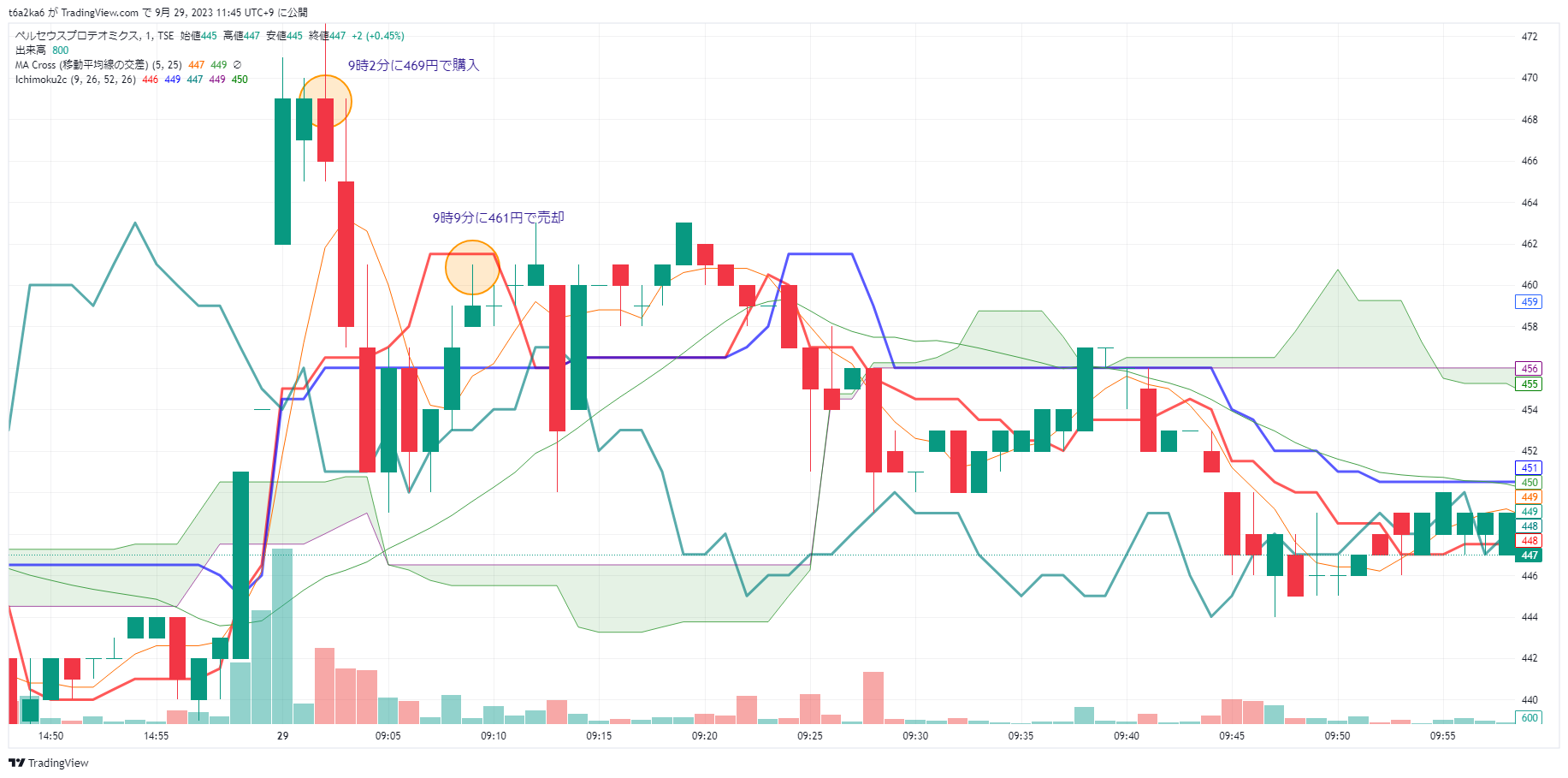 ペルセウスプロテオミクスですが、寄り付けに飛びついてみました。飛びついたが最後、そこが高値掴みで、下落しました。そして、少し戻したところで売却しました。
