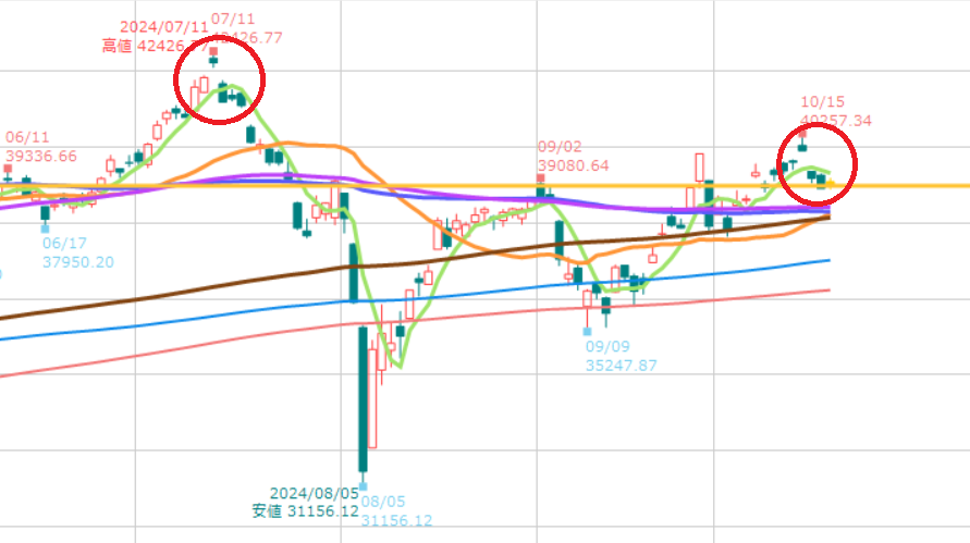 下の画像日経平均の日足なんですが、赤丸つけたところ、似てると思いませんか。8月5日みたいになったら、やばいですね。