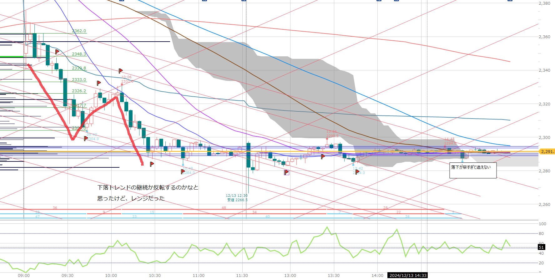 昨日からの下落トレンドが続き、10時30分を境に反発するのかなと、それとも下落継続かなと思いきや、引けまでレンジ!