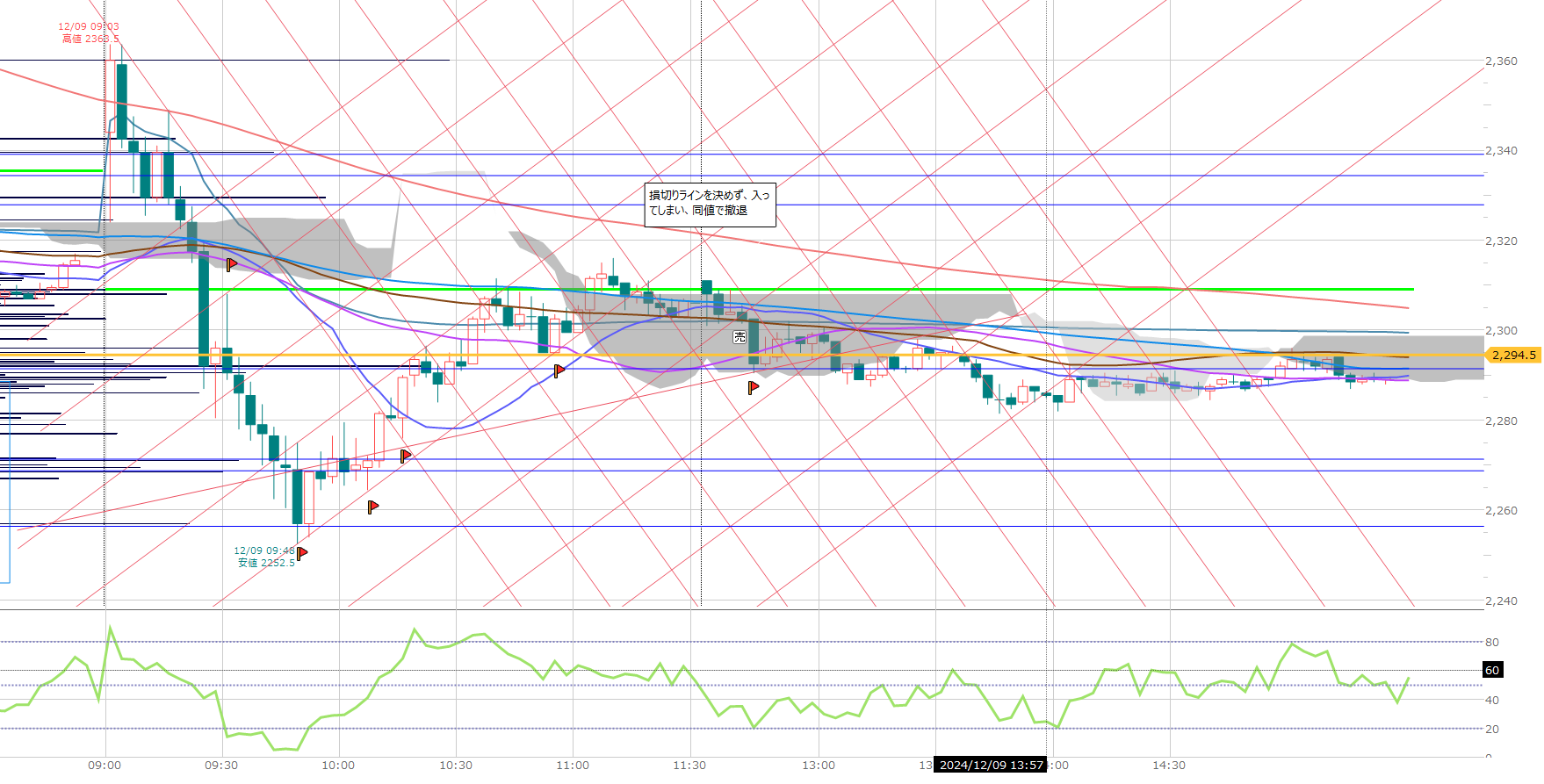 ラインを割ったので、エントリーした。しかし、上に持っていかれたので、戻ってきたところで同値撤退した。