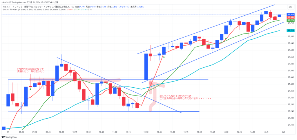 日経レバは27425円近辺がレジスタンスになっていて、貫通したり跳ね返したり。異様に強かったですね。後場の寄付きGUは三角保ち合いの突破。なんですかね~。凄腕さんで、ここ読み切っていた人いましたけど、さっぱりわかりません。