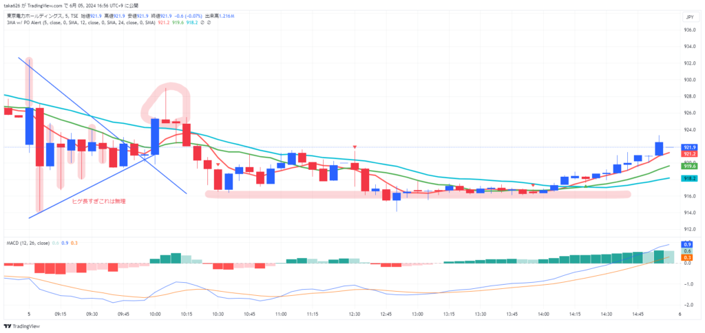 東電はここまで下がるだろうという所でショート指値を入れて置いたら、ちょうど刺さって、一瞬戻ったところで利確しました。でも、この後、めちゃくちゃ上げていったんですよ。これは紙一重で爆損でした。