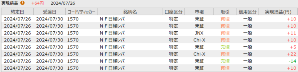 64円のプラスでした。マウスの挙動がおかしくて、2回誤発注してしまい、1回はプラスで逃れられたけど、2回目はマイナスを出してしまった。。。
