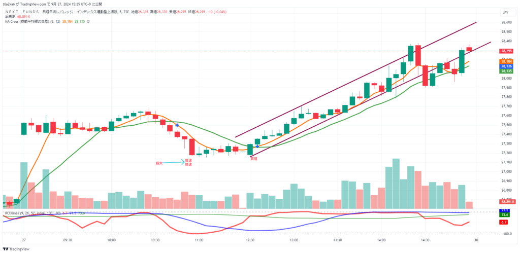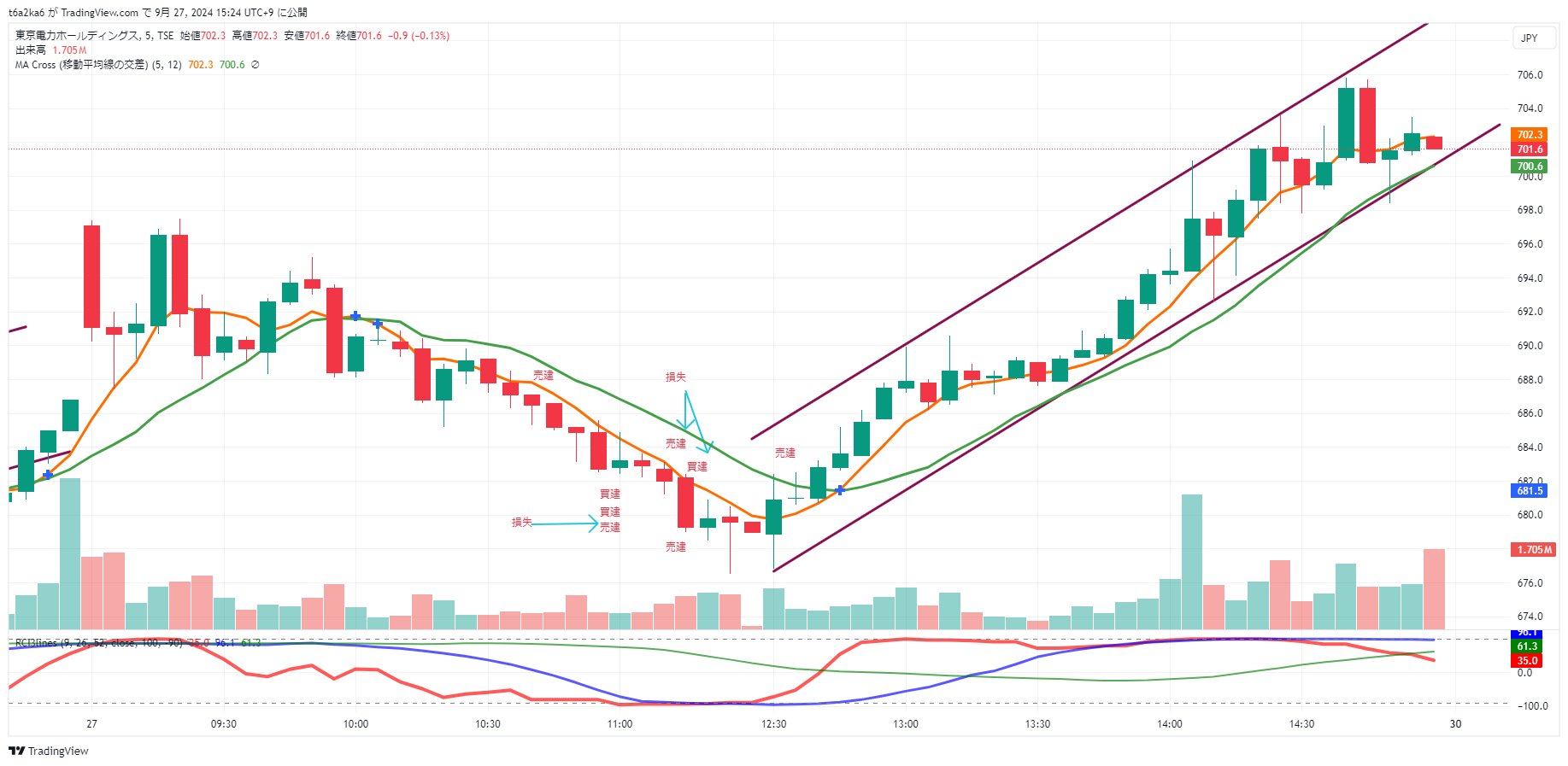 ・後場は1回集中してトレードしようと決意して、1トレードうまく入れた。でも利幅伸ばせず。残念。