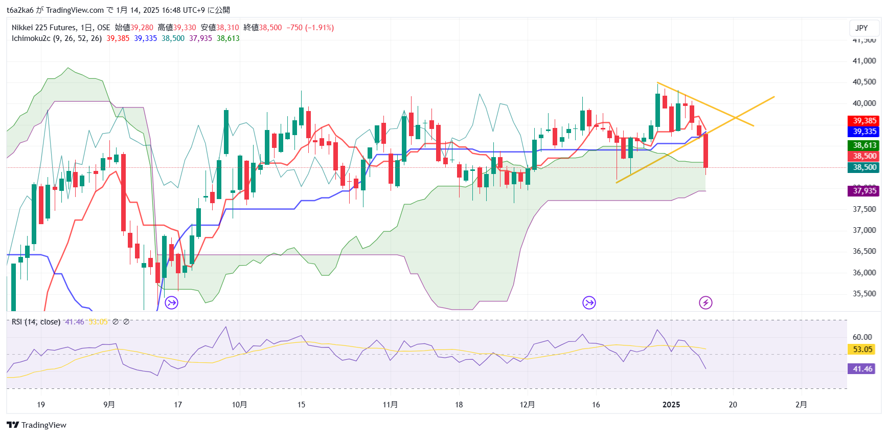 こちら先物の日足チャートですが、保ち合い抜けましたね。38000円付近のしこりを貫いたら37000円目指しそうですね。