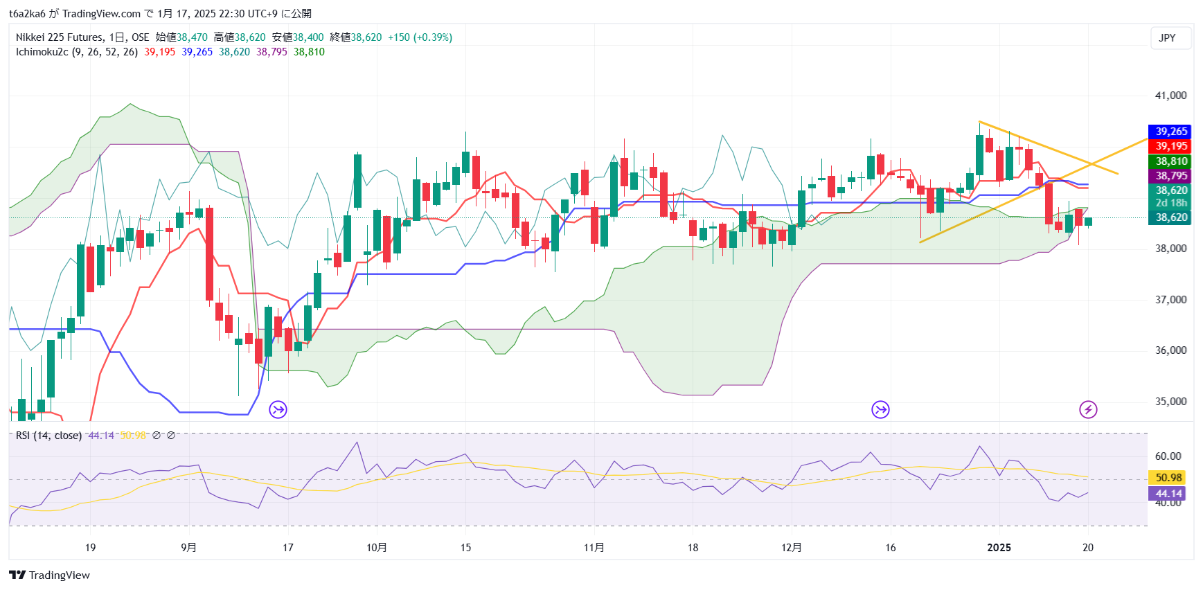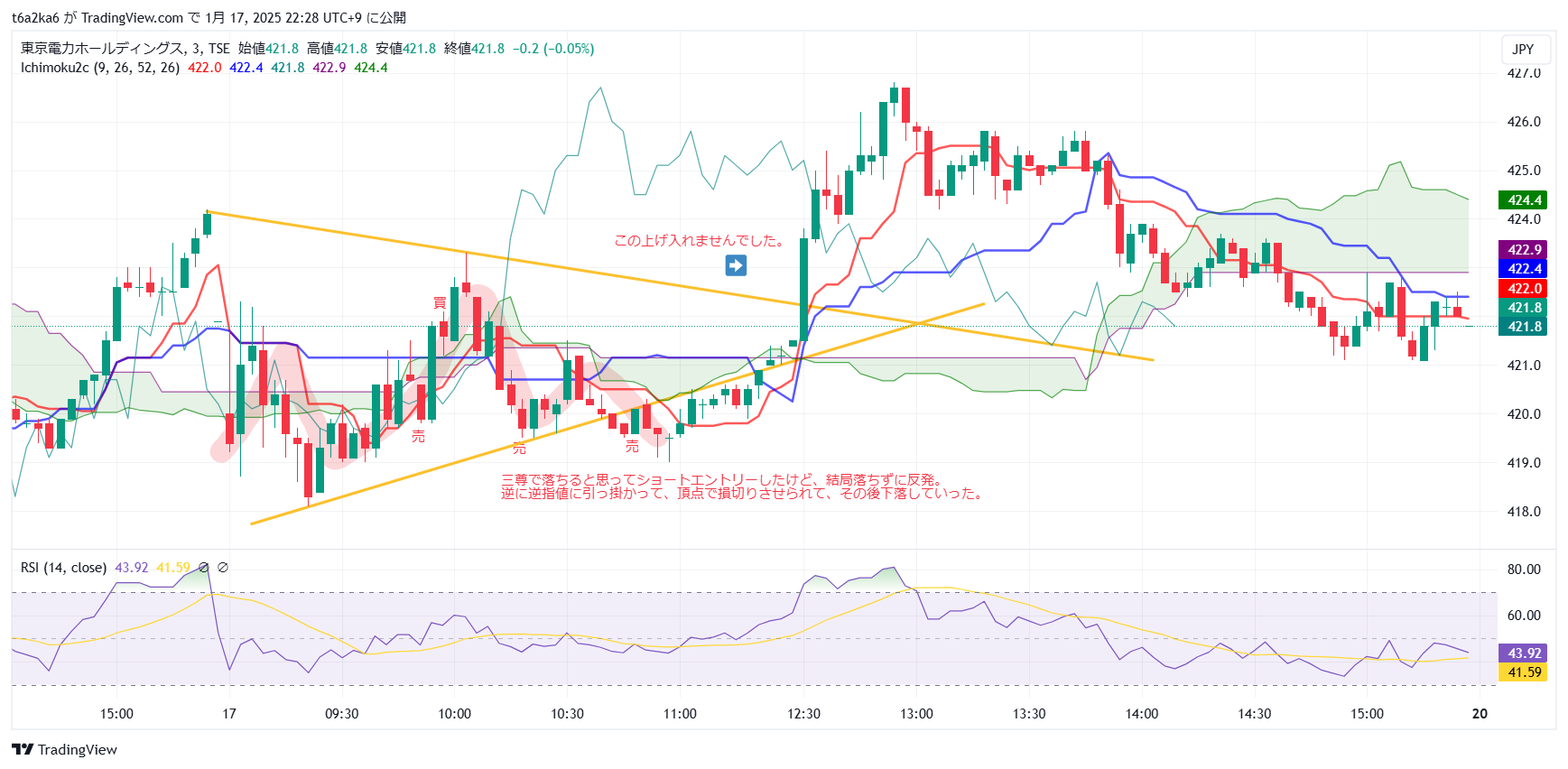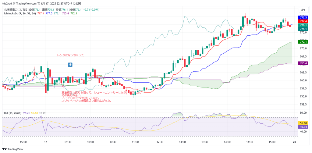 北海道電力は、ラインは引いてなくて、完全に一目均衡表の基準線ブレイク目線で入りました。
