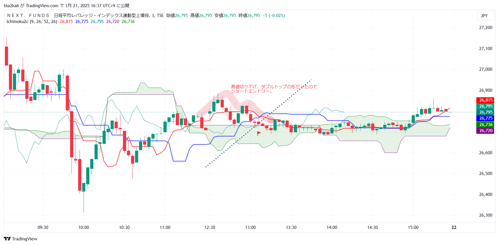 ダブルトップを形成していたのと、トレンドラインを割ったので、下がると思ってショートエントリー。こちらは利確できました。