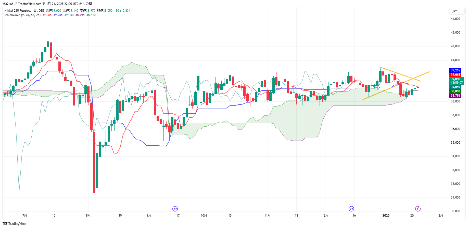 こちら先物の日足チャートですが、39000を突破しました。39500、600あたりの上値が重そうですね。