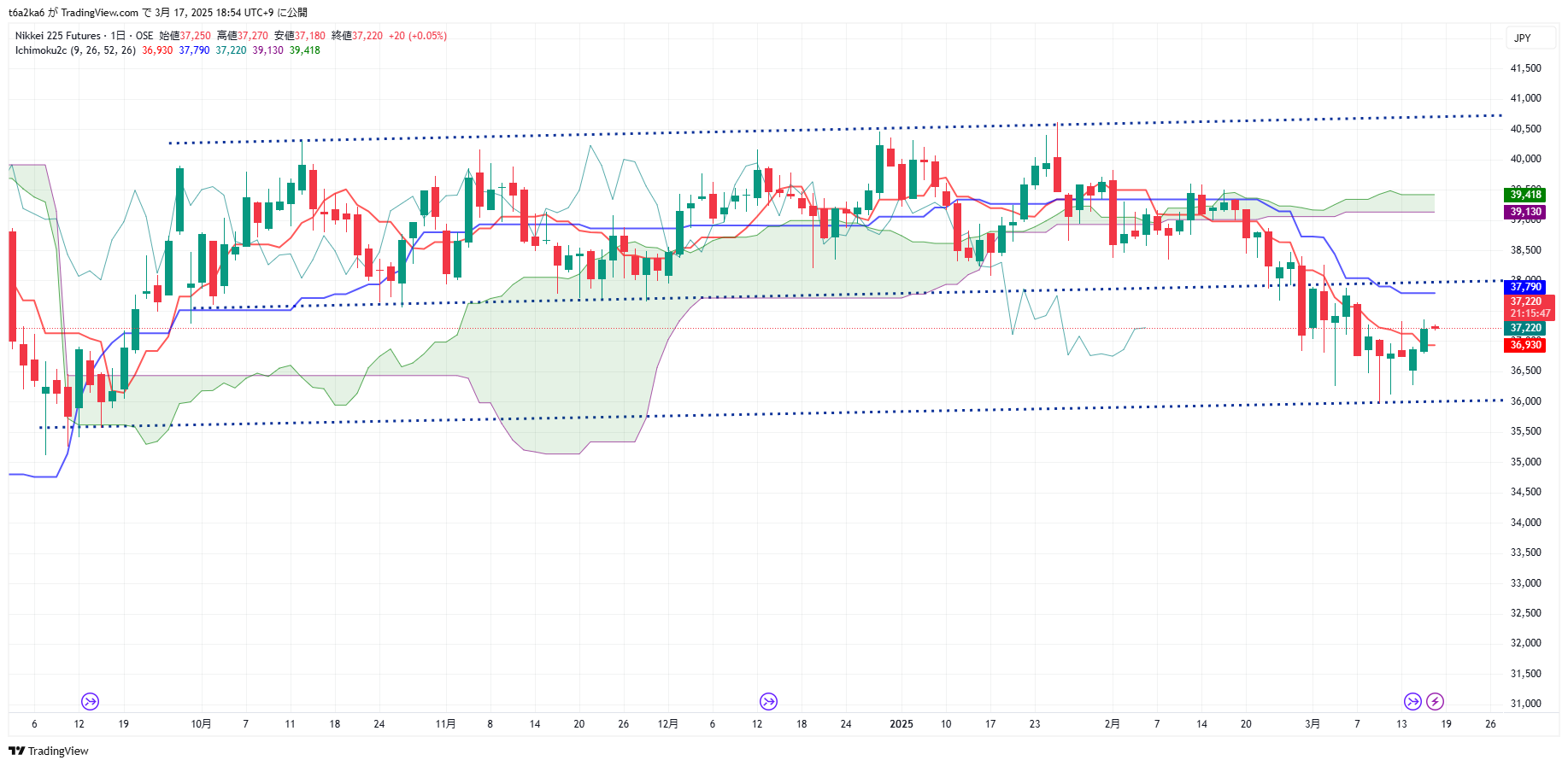 こちら先物の日足チャートです。レンジ内で揉むのか、ブレイクするのか。3月中にどう動くのか見ものです。